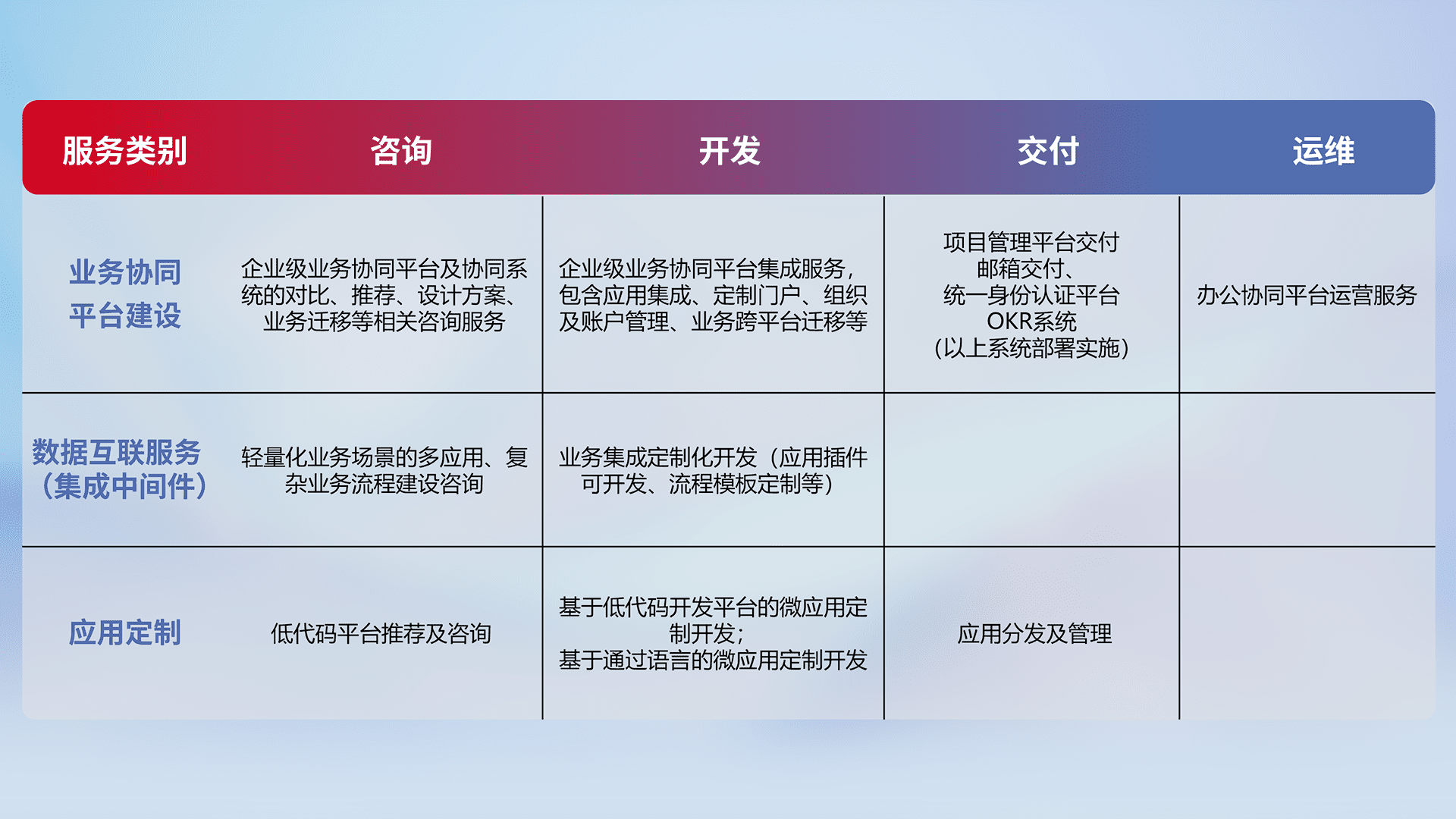 针对钉钉、、、、企微、、、IDaas等平台级产品提供产品的规划、、、、方案、、交付、、定制化开发等服务,,,实现如统一协同办公、、智能客户服务、、混合会议管理、、、、智能数据查询、、、、等业务场景,,,,实现数字化转型。。。。